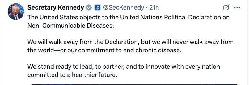 The following statement rejecting the United Nations Political declaration on Non-Communicable Diseases was made prior to Secretary Kennedy’s speech to the United Nations General Assembly.