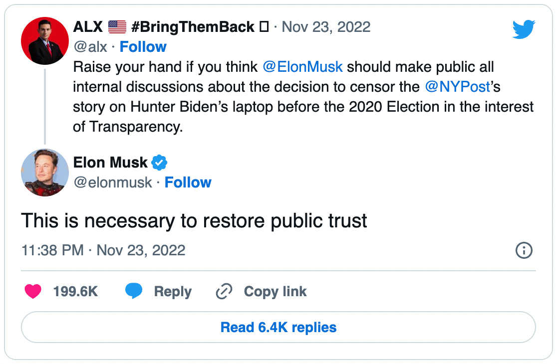 To that end, the “truth” of the corporate media subterfuge concerning the “Hunter Biden Laptop” story may soon be revealed by Mr. Elon Musk. If so, then this is a shot across the bow of corporate media and the Administrative State. I suspect that Elon has the receipts on much of what has gone on. And he is in a position to enforce “new rules”. Maybe, maybe, there is hope for the cause of integrity.
