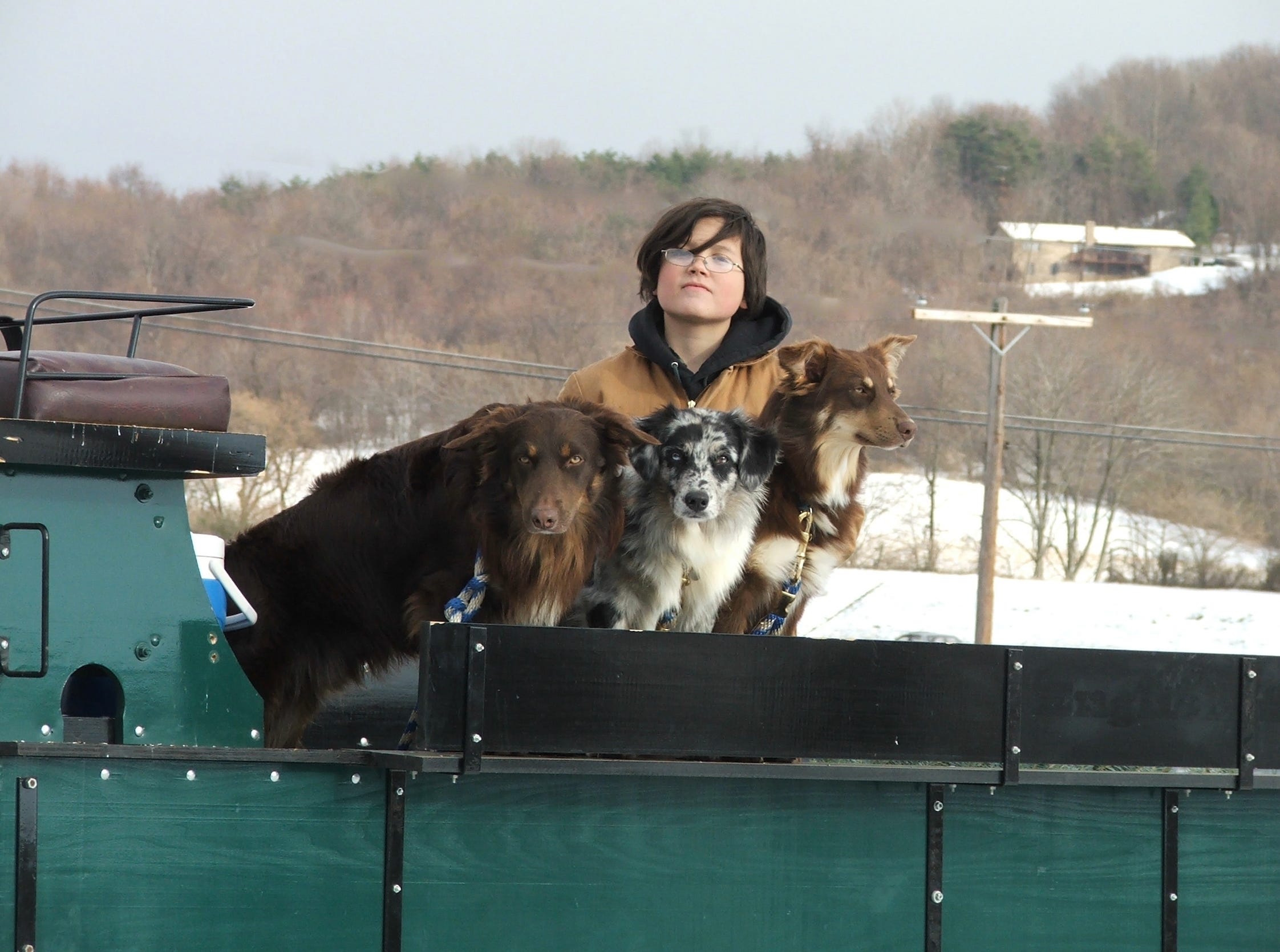 (One of our boys in the back of the wagon - with Rojo, Luna and Cal. Rojo and Cal were also great groundhog hunters. Luna -not so much.).