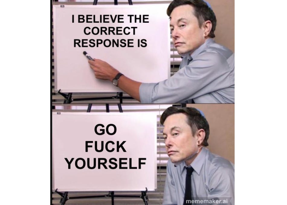 I’m an old school teacher prude who never so much as uttered “shut up” and I’m laughing out loud with joy that Elon Musk has finally publicly said what we all think. Corporate America “Go F*** Yourself!!”