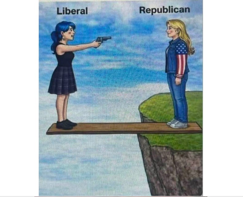 My favorite is the Liberal vs Republican. Republicans will get this on first glance while Liberals will fail to get it. It sums all about society's structure and human personality defects. A meme so simple but so very, very effective.