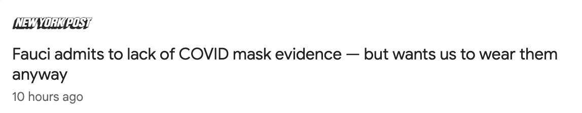 Despite being unable to actually dispute the Cochrane Review meta-analysis that showed no efficacy in mask wearing against COVID-19, Fauci still pushes mask wearing for “individual benefit”. You can’t make this stuff up.
