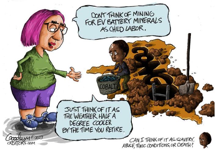 Speaking of electric cars, wait until you read the following: a typical ev battery weighs approximately 1,000 lbs & is about the size of a car trunk. It contains 25 lbs. of lithium, 60 lbs. of nickel, 44 lbs. of maganese, 30 lbs of cobalt, 200 lbs of copper & 400 lbs. of aluminum, steel, & plastic. It contains over 6,000 individual lithium-ion cells. Most of these materials are derived from mining operations. To manufacture each ev battery, the following material must be processed: 25,000 ibs. of brine for the lithium, 30,000 lbs. of ore for the cobalt, 5,000 lbs.of ore for the nickel, & 25,000 lbs. of ore for copper. All told, suppliers must dig up 500,000 lbs. of the earth's crust for just one battery. This information is taken from an American Thinker's article by Kent Moss on 9/25/2022. Now contemplate this...https://needtoknow.news/2023/06/china-is-throwing-away-fields-of-electric-cars/