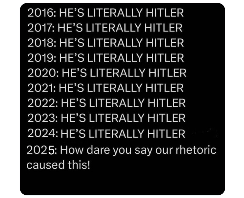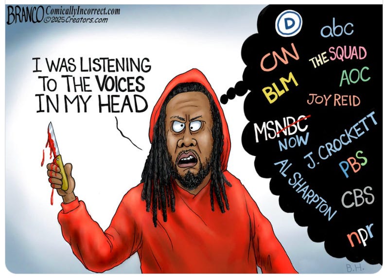 I am angry. When I watch these leftist politicians push their hatred of division with words like fascist, Nazi, homophobic, transphobic, then say their words have nothing to do with a young person picking up a rifle and killing someone. This is the ultimate extension of them taking no responsibility for their coercive rhetoric. I’m tired of their lies that turn into murder, the jailing of innocent people, the destruction of families. I watched these narcissists like Jasmine Crocket, AOC, Nancy Pelosi, all shift the blame of their weaponized words of manipulating propaganda deny the obvious results of their actions. The list is long and deep, full of these communists that deliberately destroy the fabric of America with their divisive lies. This all a desperate attempt to hold on to their diminished power, and to hell with the lives and families they destroy.