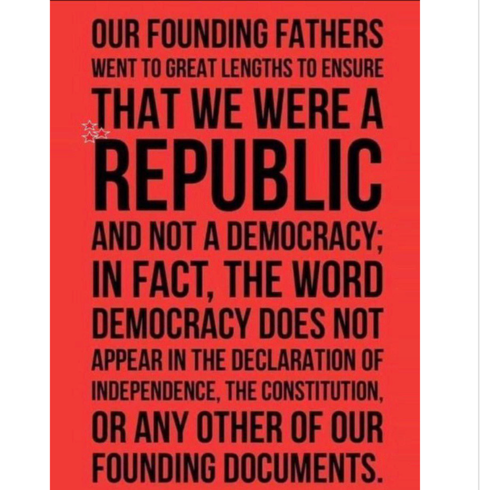 The word democracy is not in the Declaration of Independence, the Bill of Rights, or the U.S. Constitution. This is because the Founding Fathers were skeptical of direct democracy, due to a concern about the potential for a "tyranny of the majority." So, our system was designed to be a representative democracy where citizens elect representatives to govern on their behalf. We live in a constitutional republic.