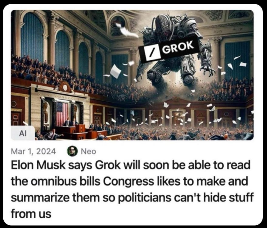 “Grok, the AI chatbot developed by his startup xAI, will soon be able to summarize complex U.S. laws before Congress passes them. This new feature aims to simplify legislation and make it more accessible to the public, allowing people to understand the "real purpose" of these laws. Grok's ability to access real-time information through X (formerly Twitter) and browse the internet enables it to provide up-to-date summaries of proposed legislation. This move comes as part of Musk's emphasis on transparency and truth in AI technology. The feature is expected to be implemented in the coming weeks and will be available to X Premium+ subscriber.” (AI summarized).
