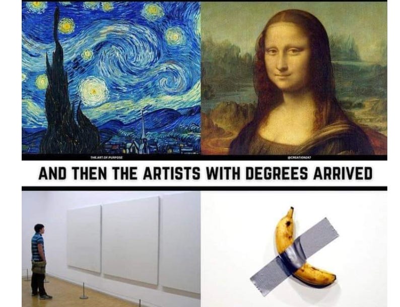 The banana and duct tape. A relative lives in NYC and told me once that most of the art galleries are just money laundering operations. Not sure if true but would not be surprised. 🙄