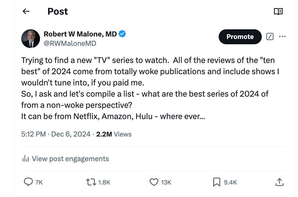 Just a side note that I no longer find any pleasure in watching TV, so I appreciate this stack which might possibly give me something unwoke and worthwhile and to watch.