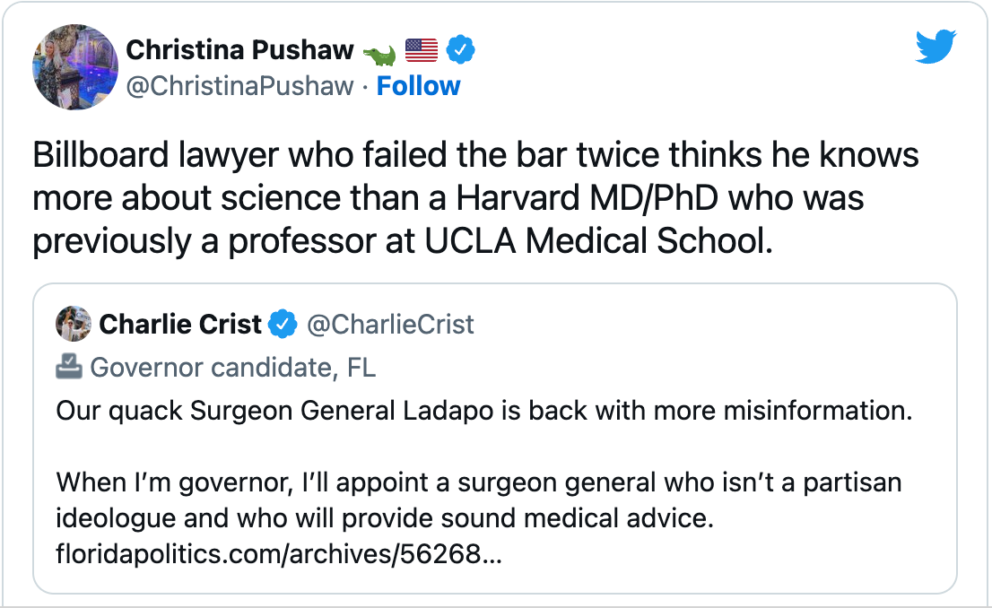 When the press release and associated study results were released, there were the usual attacks. Charlie Christ, running for Governor in opposition to sitting Governor Ron DeSantis, stated "our quack Surgeon General Ladapo is back with more misinformation. When I'm governor, I'll appoint a surgeon general who isn't a partisan ideologue and who will provide sound medical advice." To which the current Governor’s spokesperson Christina Pushaw replied "Billboard lawyer who failed the bar twice thinks he knows more about science than a Harvard MD/PhD who was previously a professor at UCLA Medical School". Ball is in your court, Mr. Crist. Thank you for your coverage of this dustup, Newsweek.
