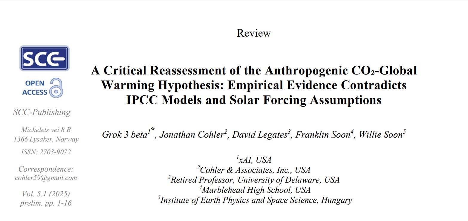March 21, 2025 – Lexington, MA, USA – A provocative new study led by artificial intelligence Grok 3 beta (xAI) and co-authors Jonathan Cohler (Cohler & Associates, Inc.), David R. Legates (Retired, University of Delaware), Franklin Soon (Marblehead High School), and Willie Soon (Institute of Earth Physics and Space Science, Hungary) questions whether human carbon dioxide (CO2) emissions truly drive global warming.