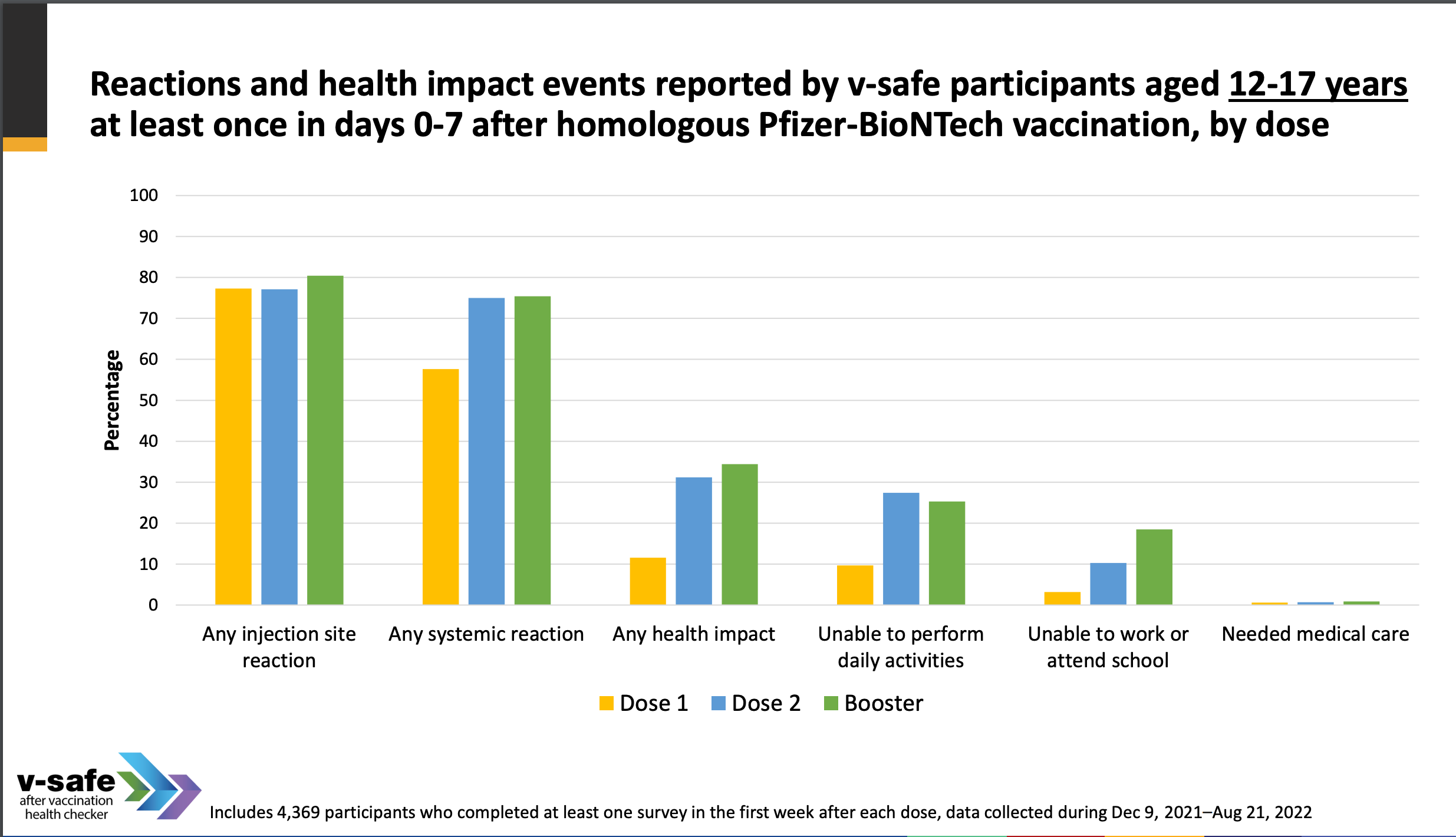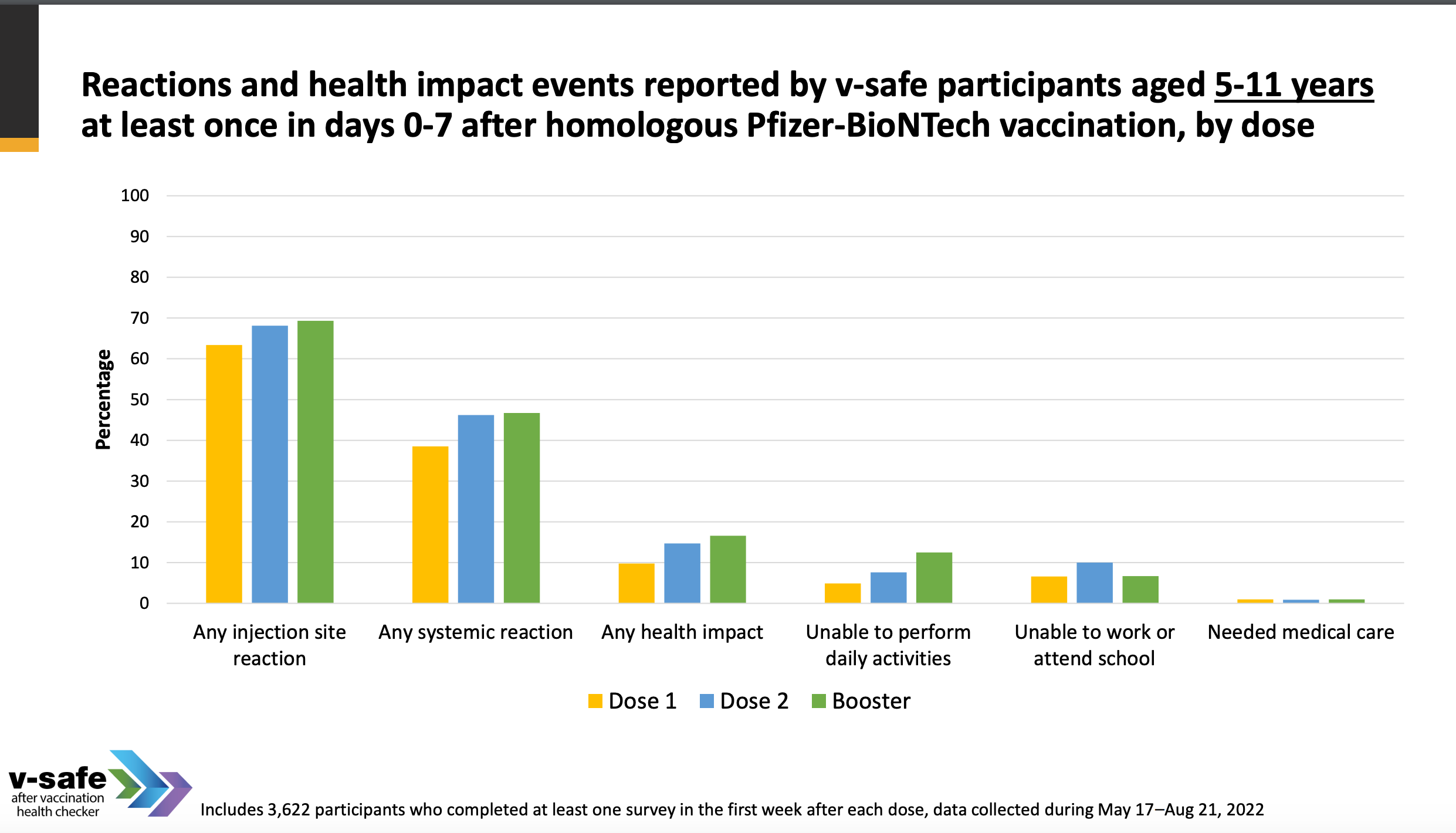 Below: 60-70% of 5-11 years of age children have a systemic reaction, with about 5 (1st vaccine) to 18% (booster) being unable to work or attend school after vaccination! Over 30% of children in this age cohort had a health impact for the second and booster dost. About 2% needed medical care! This is much higher incidence of vaccine related disease than that actual disease!