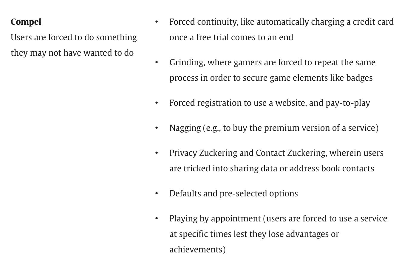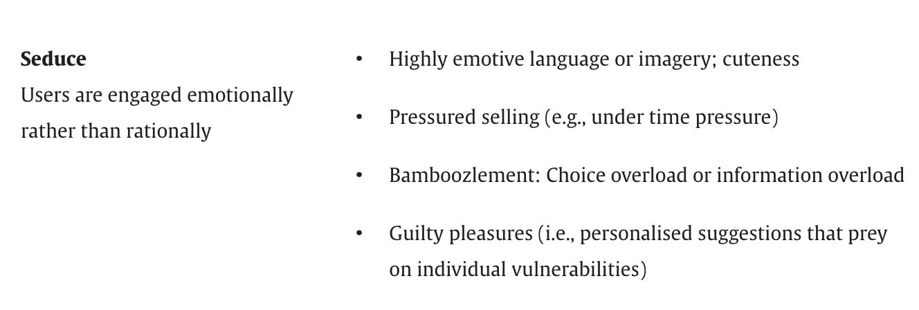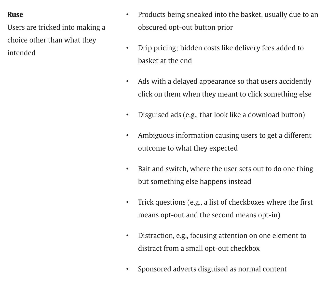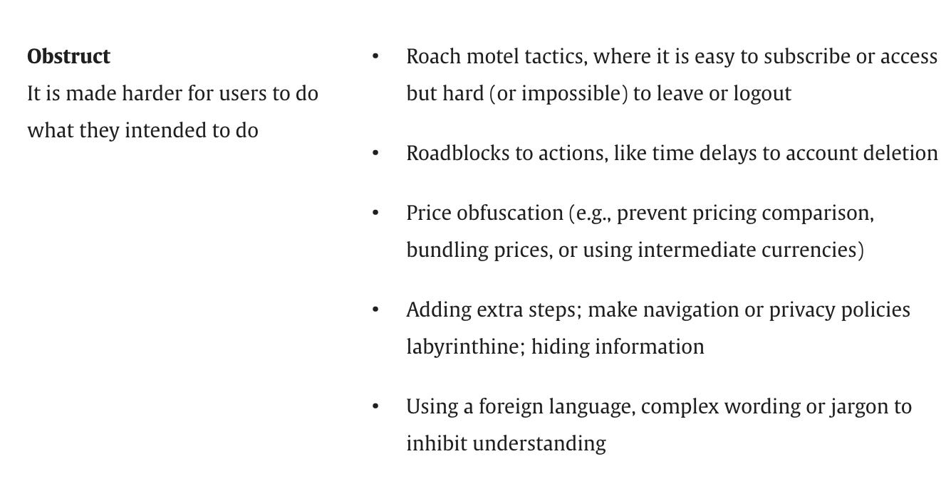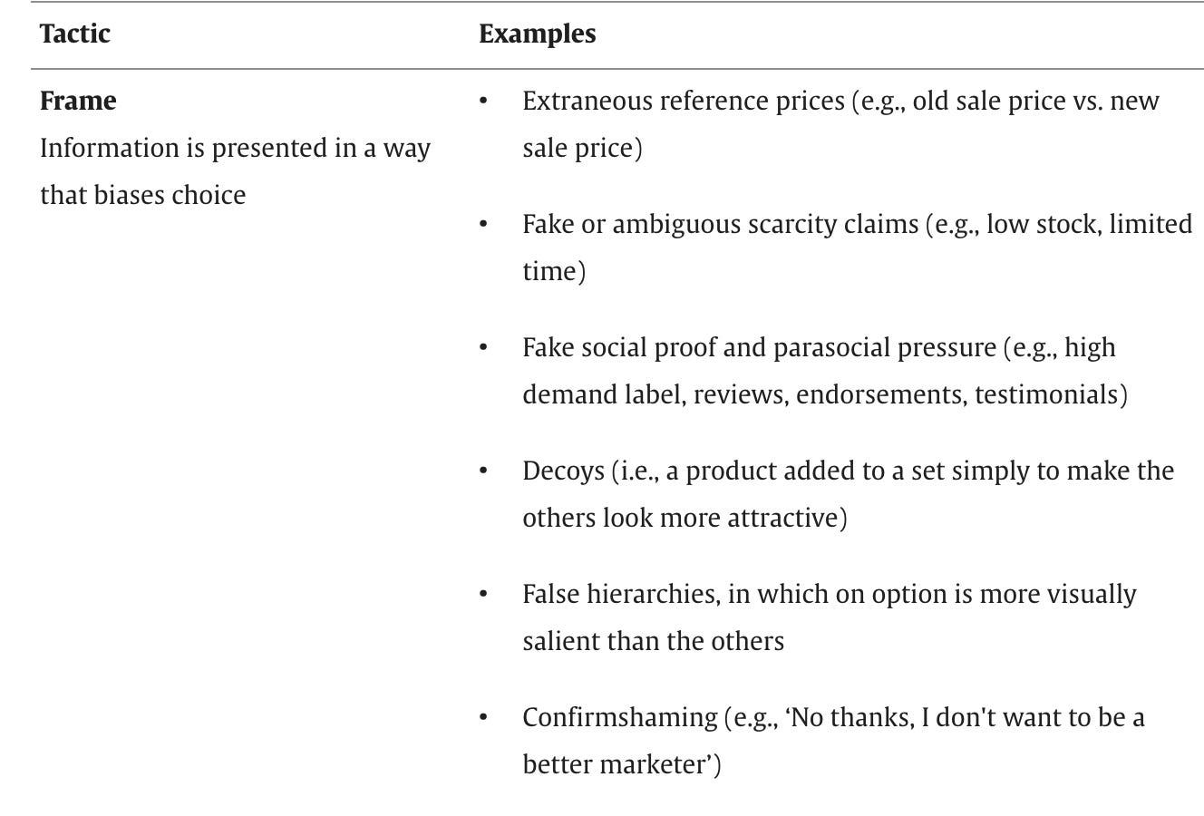 When these nudges fail to be transparent, optional, and beneficial, they can become 'dark patterns', categorised here under the acronym FORCES (Frame, Obstruct, Ruse, Compel, Entangle, Seduce).