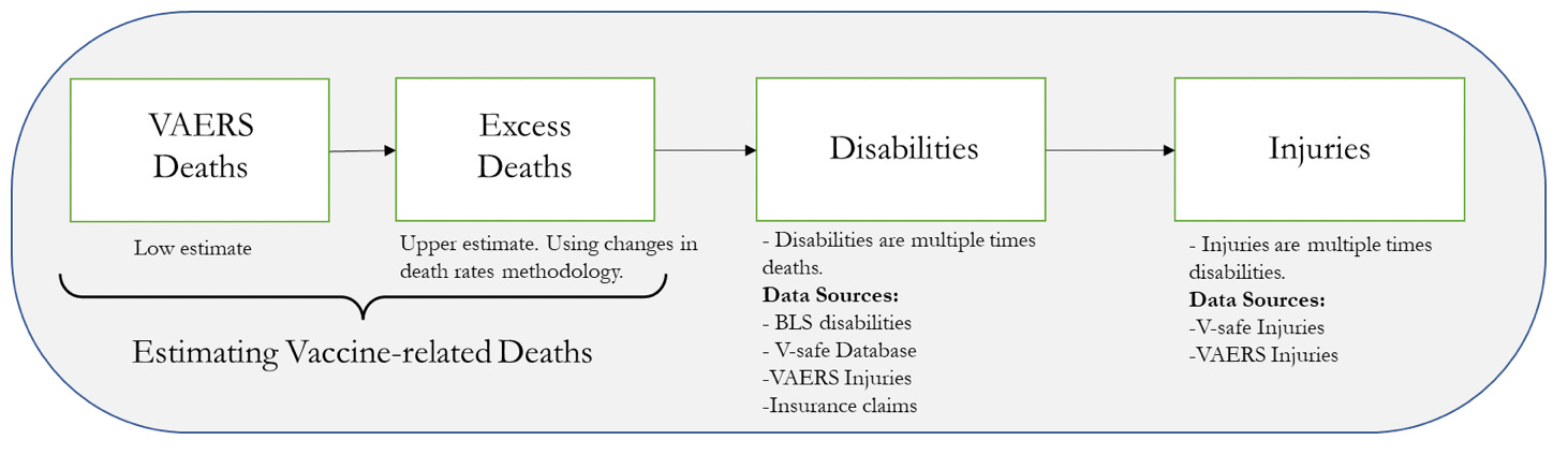 All the evidence that we observed led us to the conclusion that the mass inoculations have a human cost that we need to assess, with adequate resource allocation, in order to prepare to manage in future years. We structured the V-Damage project to analyse different data sources that provide auxiliary information about the phenomenon, such as the VAERS and V-Safe databases, as well as insurance company data. First the human cost will be investigated, and in step 2, we will estimate the economic cost (see Figure 3).