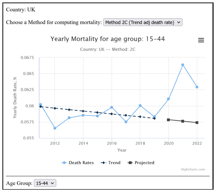 Figure 1 - Yearly excess mortality for 15-44 in the UK