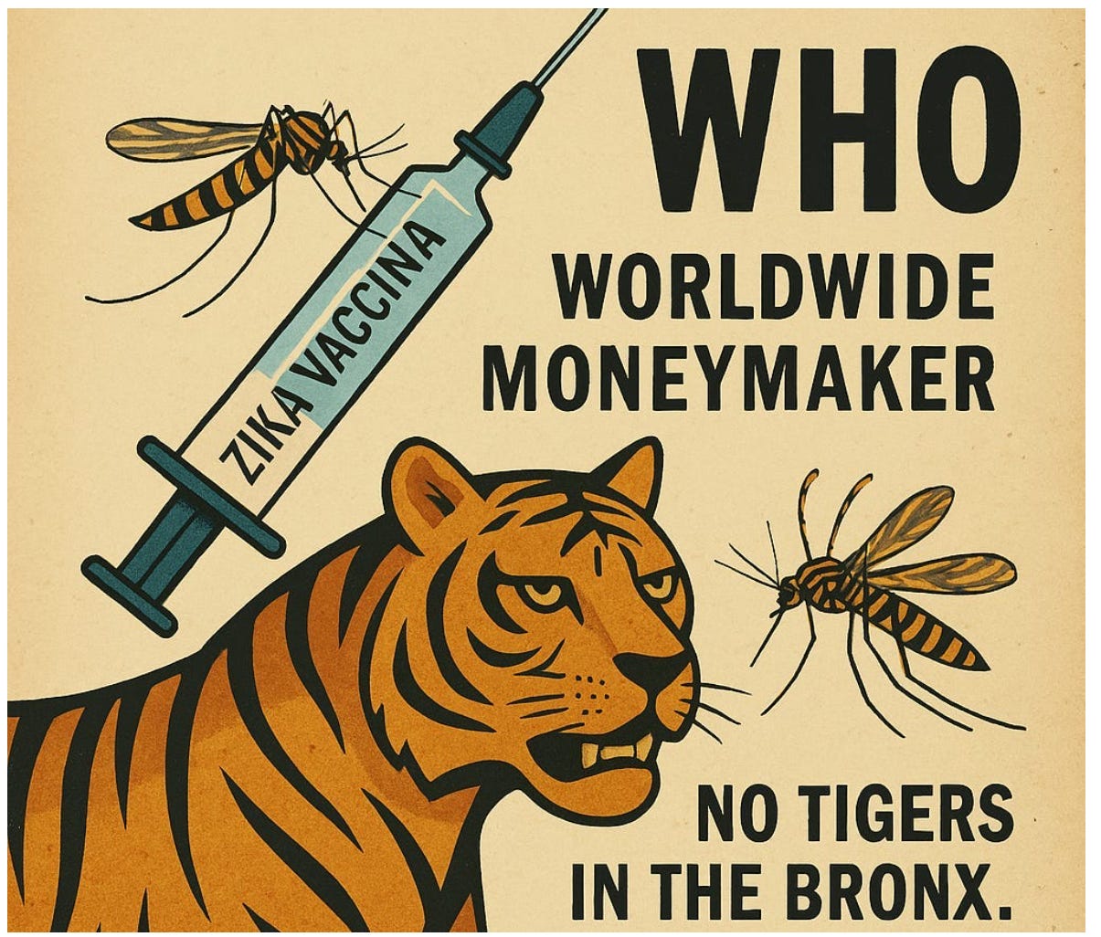 Companies like Moderna, Takeda, and Pfizer stand to profit if a Zika vaccine is greenlit by the WHO or CDC, creating a “forever product” that persists regardless of need. Once approved, they’ll claim victory over a threat that never fully materialized—or, as my father, a Bronx attorney, used to joke, “I’m the official tiger catcher for the Bronx. [No tigers?] ... See what a good job I’m doing!”