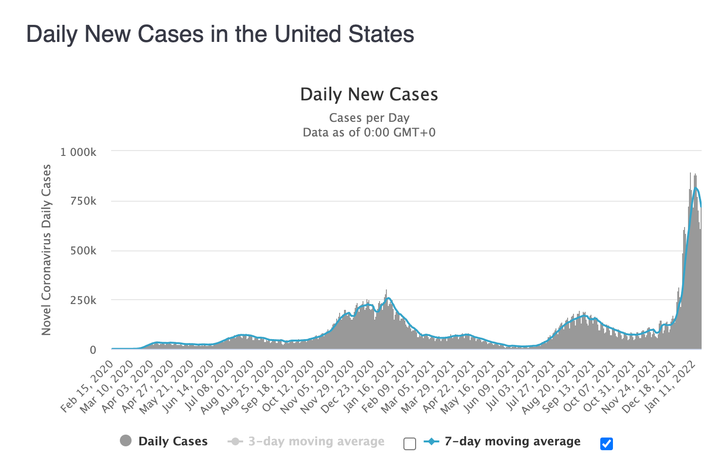 “Plunge” seems to be a strong word for a downward trend - but good news is good news. Below is a chart of World Meters for daily new cases reported in the USA (last day reported January 20, 2022).