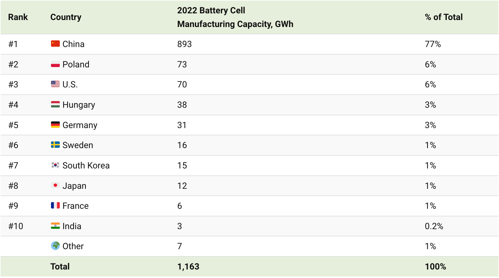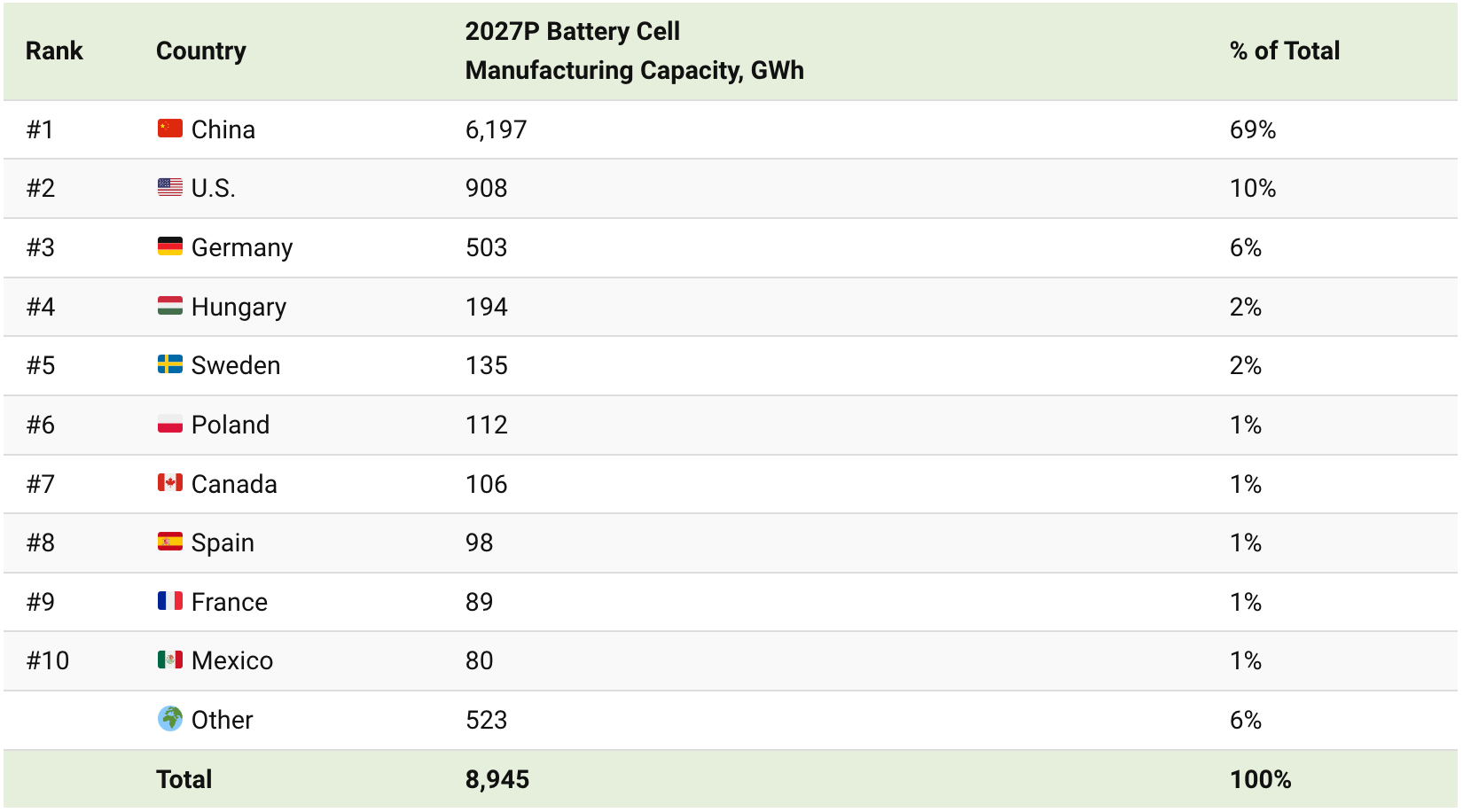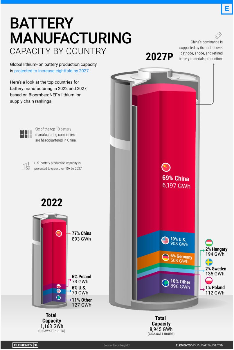 China’s Near-Monopoly Continues Through 2027. Global lithium-ion manufacturing capacity is projected to increase eightfold in the next five years. Here are the top 10 countries by projected battery production capacity in 2027. Source: Visual Capitalist.