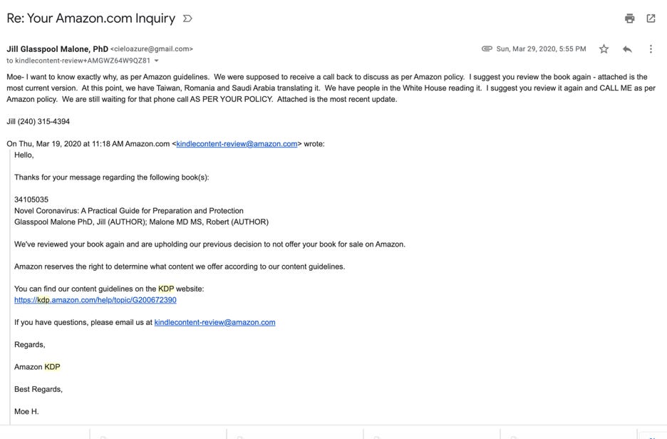 The WHO declared COVID-19 a pandemic on March 11, 2020. Jill’s book first got stuck in review the day before. Who was pulling strings at Amazon even before the pandemic was officially declared? 🤔