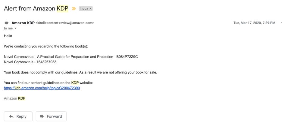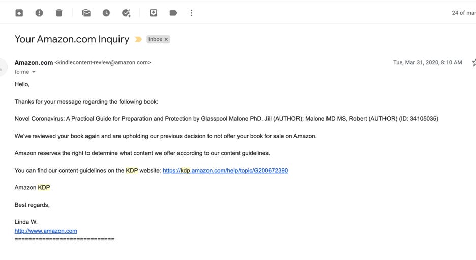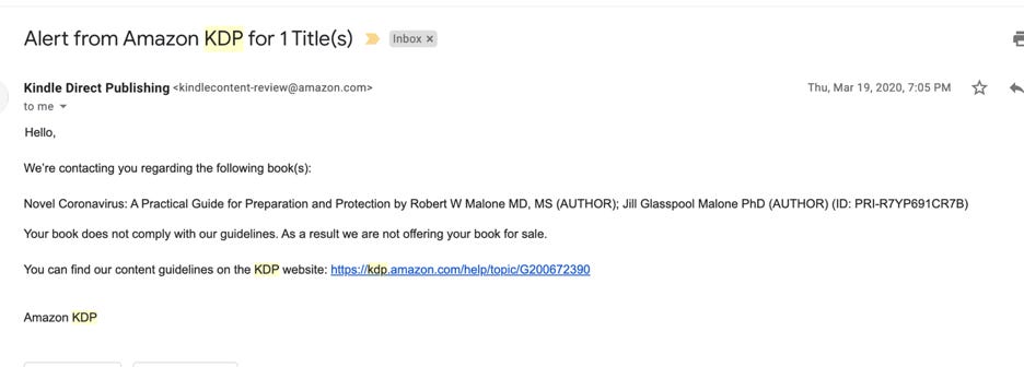 Then we got our first taste of what would become a major theme throughout the entire history of the COVID-19 public health event. Jill’s book was censored by Amazon. When we went to upload the most current edition in March, we received these messages (we phoned KDP Amazon and were told this was a normal process of delay due to lack of editors).