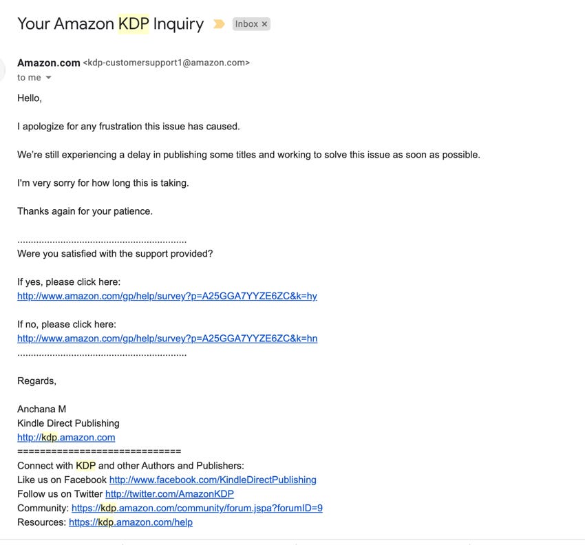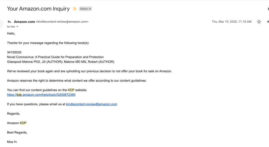 Next we received the many messages below, stating that the book did not meet “community standards”, a phrase that many have come to recognize as what has become the standard phrase used to justify censorship in the time of COVID. We spoke with multiple people at KDP, who assured us that the reviewers would speak to us about why, as that was standard Amazon policy. That usually such problems could be worked out.