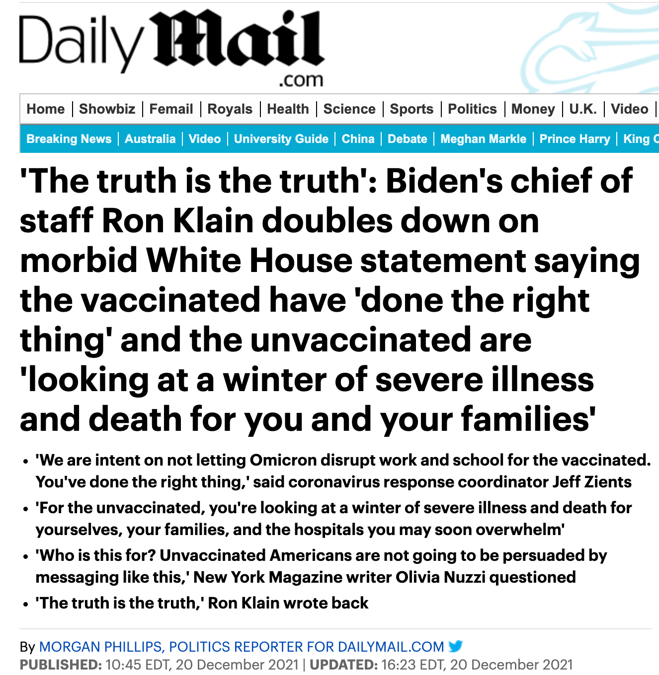 During his tenure in Biden’s White House, Klain pursued a vaccine-only strategy and directed White House messaging relating to this policy including that horrible White House statement saying the vaccinated have 'done the right thing' and the unvaccinated are 'looking at a winter of severe illness and death for you and your families'. Adding insult to injury, Klain is the one that asserted that 'The truth is the truth' - remember that as Chief of Staff, Klain was directly responsible for “Directing, managing and overseeing all policy development”.