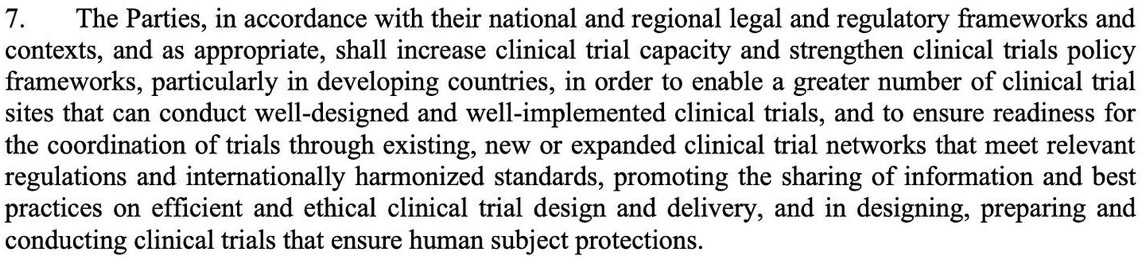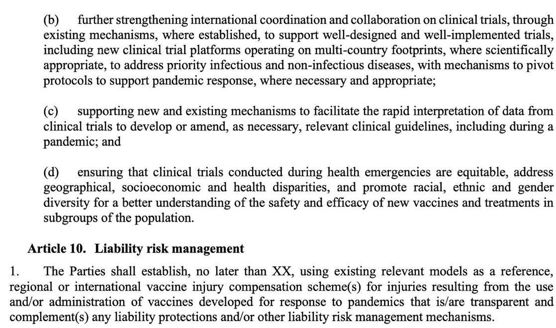 Vaccines normally take 10-15 years to be developed. In case you thought the COVID vaccines took too long to be rolled out (326 days from availability of the viral sequence to authorization of the first US COVID vaccine) the WHO treaty draft has plans to shorten testing. There will be new clinical trial platforms. Nations must increase clinical trial capacity. (Might that mean mandating people to be human subjects in out-of-the-way places like Africa, for example?) And there will be new “mechanisms to facilitate the rapid interpretation of data from clinical trials” as well as “strategies for managing liability risks.”