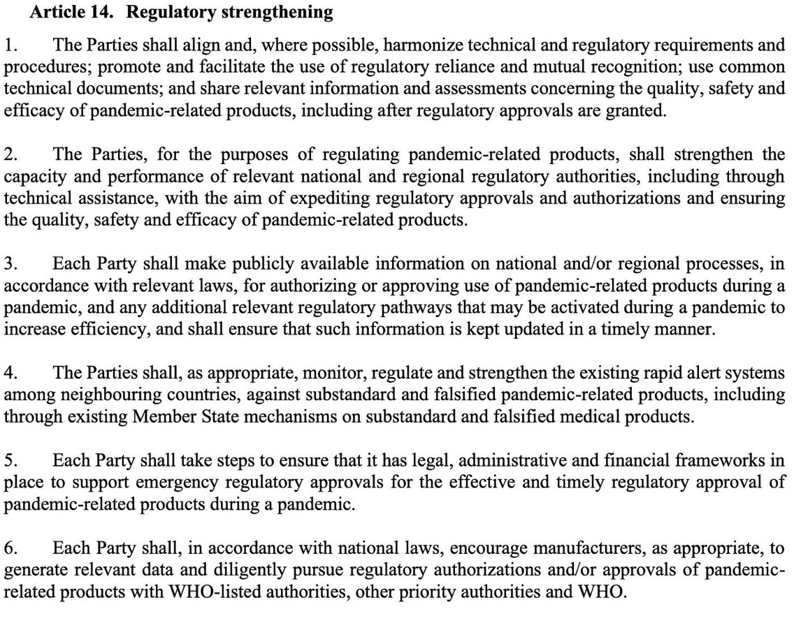 The pandemic treaty draft also demands weakening the strict national regulation of medical drugs and vaccines during emergencies, under the rubric of “Regulatory Strengthening.” As announced in the UK recently, ‘trusted partner’ approvals will be used to speed licensure of medical products. This means that if a drug or vaccine has been approved by a partner country, the UK can adopt the partner's decision on licensure and bypass an independent analysis by UK regulators. What this does is move nations in the direction of a single regulatory agency approval or authorization, which would be immediately adopted by other nations. (p 25).