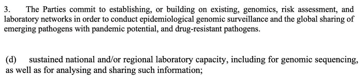 But the WHO in its June 2023 Bureau Text of the Draft Pandemic Treaty has a plan that is the exact opposite of this. In the WHO’s draft treaty, which most nations’ rulers appear to have bought into, all governments will share all viruses and bacteria they come up with that are determined to have “pandemic potential” — share them with the WHO and other governments, putting their genomic sequences online. No, I am not making this up. (See screenshots from the draft treaty below.) Then the WHO and all the Fauci’s of the world would gain access to all the newly identified dangerous viruses. Would hackers also gain access to the sequences? This pandemic plan should make you feel anything but secure.