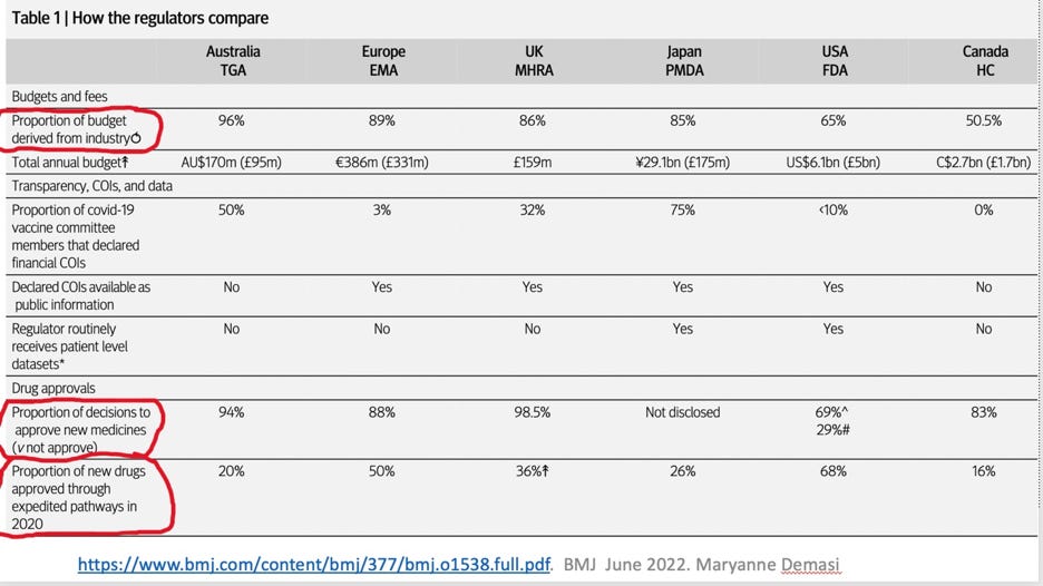 One might predict that the least rigorous regulator would quickly be selected by product manufacturers to make licensing decisions on their products. Most nations' drug regulators are funded by pharmaceutical firms, who pay for the evaluations. It should come as no surprise that the % of their budgets that is funded by pharma is directly related to the % of drug approvals issued. We might even see the prices of drug evaluations paid by Pharma go up as the quality of the evaluations goes down. Below is fascinating information on the regulators of drugs and vaccines around the world and the public versus private funding they receive