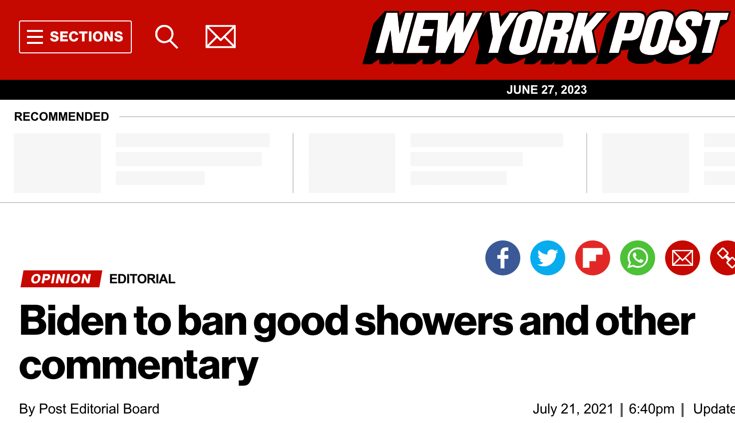 No matter where you live, shower heads must save water - because, self evidently, for those of us living in areas where water scarcity isn’t an issue, we must support those who live in water scarce areas. Fair is fair - it is all about equity, right? That is the socialists’ creed.