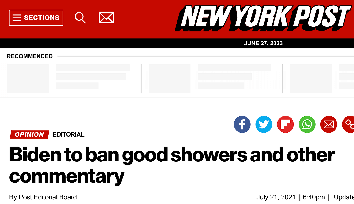 As Trump, during his presidency, had blocked the EPA ruling about universal water saving shower heads, this is yet another a F***you to Trump by Biden. Come 2024, we can only hope that this will be overturned. As the EPA regulations do not supersede states rights, this ban on normal shower heads should be overturned. The basic state’s right - that state law supersede’s governmental regulations unless Congress makes a Federal law, is an important element of our Constitution and Bill of Rights. The Supreme Court makes this very clear in West Virginia versus the EPA.