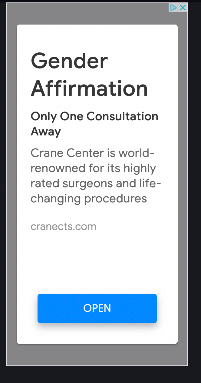 In reading what the actual medical procedures consist of, and finding various “fake” articles meant to spoof those who don’t agree with these procedures (such as the one cited at the beginning of this essay), I discovered that these procedures are being marketed to children. I was stunned to find what appears to be automated Google Ad advertising of transgender surgical centers on sites designed specifically for children and teens. For instance, I encountered these advertisements (below) when reviewing the website ifunny.io, after searching the keywords “gender affirmation” on a search engine earlier. This is a website and app targeting mostly children and young adults where one can view and post funny memes/cartoons. Frankly, the memes are pretty much gross, not very funny and for the most part, I wouldn’t have let my kids on there. But, I am not everyone, and it is clear that this site is targeted to a young audience.