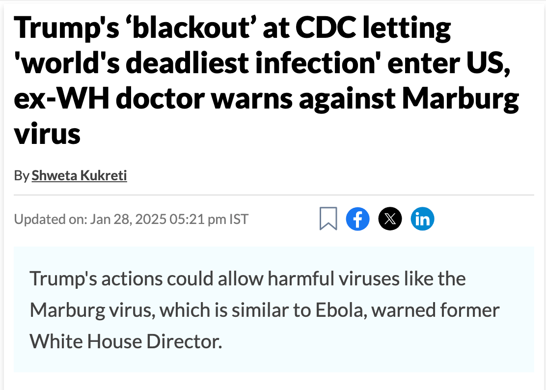 Promoted Narrative circa January 2025: You should be afraid, you should be very afraid. It is all Trump’s fault. There is a Marburg outbreak crisis in Tanzania! Soon it will jump across the Atlantic and begin indiscriminately killing Americans like a rabid wolf. The CDC is the only thing preventing this from happening, and Trump is politically interfering with the CDC doing it’s noble work in close cooperation with the WHO. The US Government needs to spend billions of dollars on vaccine and monoclonal antibody development/manufacturing RIGHT NOW to prevent the terrible thing from happening. This is only one example of how Trump and his policies are putting Americans at risk from widespread disease and death caused by scary viruses.