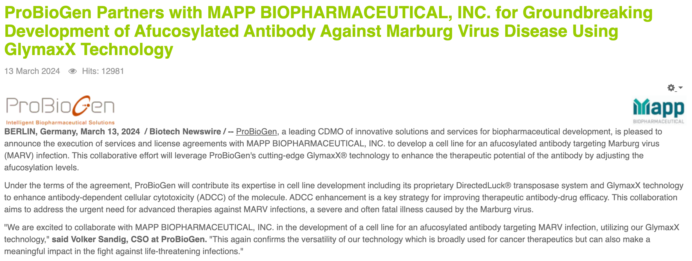 In March 2024, Mapp Biopharmaceutical entered into a collaboration with ProBioGen, a contract development and manufacturing organization (CDMO), to develop a cell line for an afucosylated antibody targeting Marburg virus infection. This collaboration leverages ProBioGen’s GlymaxX® technology to enhance the therapeutic potential of the antibody by adjusting its afucosylation levels, thereby improving its antibody-dependent cellular cytotoxicity (ADCC) and overall efficacy against the virus. The project has been funded in whole or in part with federal funds from the U.S. Department of Health and Human Services, BARDA, under contract number 75A50122C00076.