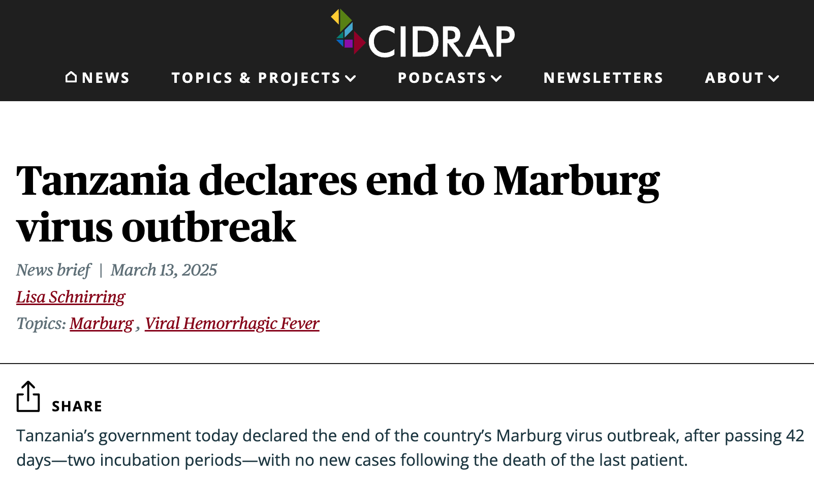 Alternative Narrative: Marburg virus has existed in Africa for millennia in various animal reservoirs. It seems to mostly be maintained in clusters of bats. Like many viral pathogens, when it does jump from it’s natural host into a human host, it is highly lethal. In the case of Marburg, so lethal that it quickly burns itself out. It is not spread by breathing or as an aerosol. Despite existing for thousands if not millions of years, there has never been a large, sustained Marburg virus outbreak. Circa January 2025, based on past outbreaks, the probability was very high that once again, the Marburg outbreak in Tanzania would be self limiting.