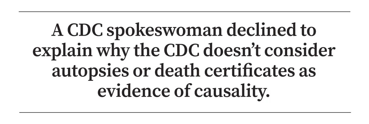 The spokeswoman declined to explain why the CDC doesn’t consider autopsies or death certificates as evidence of causality, the criteria that would establish vaccine-caused deaths, or whether the numbers have been updated since 2023. She also declined to answer questions about specific deaths outlined in the file, citing “privacy and confidentiality.”