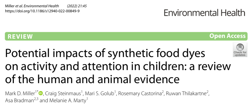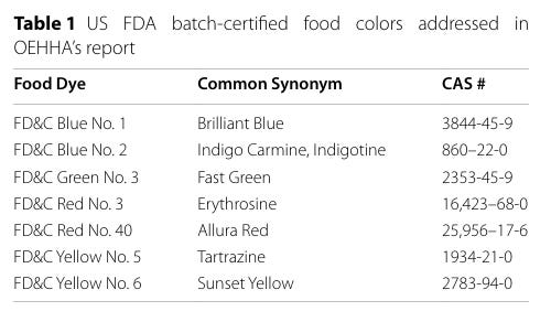 Abstract: Concern that synthetic food dyes may impact behavior in children prompted a review by the California Office of Environmental Health Hazard Assessment (OEHHA). OEHHA conducted a systematic review of the epidemiologic research on synthetic food dyes and neurobehavioral outcomes in children with or without identified behavioral disorders (particularly attention and activity). We also conducted a search of the animal toxicology literature to identify studies of neurobehavioral effects in laboratory animals exposed to synthetic food dyes. Finally, we conducted a hazard characterization of the potential neurobehavioral impacts of food dye consumption. We identified 27 clinical trials of children exposed to synthetic food dyes in this review, of which 25 were challenge studies. All studies used a cross-over design and most were double blinded and the cross-over design was randomized. Sixteen (64%) out of 25 challenge studies identified some evidence of a positive association, and in 13 (52%) the association was statistically significant. These studies support a relationship between food dye exposure and adverse behavioral outcomes in children. Animal toxicology literature provides additional support for effects on behavior. Together, the human clinical trials and animal toxicology literature support an association between synthetic food dyes and behavioral impacts in children. The current Food and Drug Administration (FDA) acceptable daily intakes are based on older studies that were not designed to assess the types of behavioral effects observed in children. For four dyes where adequate dose-response data from animal and human studies were available, comparisons of the effective doses in studies that measured behavioral or brain effects following exposure to synthetic food dyes indicate that the basis of the ADIs may not be adequate to protect neurobehavior in susceptible children. There is a need to re-evaluate exposure in children and for additional research to provide a more complete database for establishing ADIs protective of neurobehavioral effects.