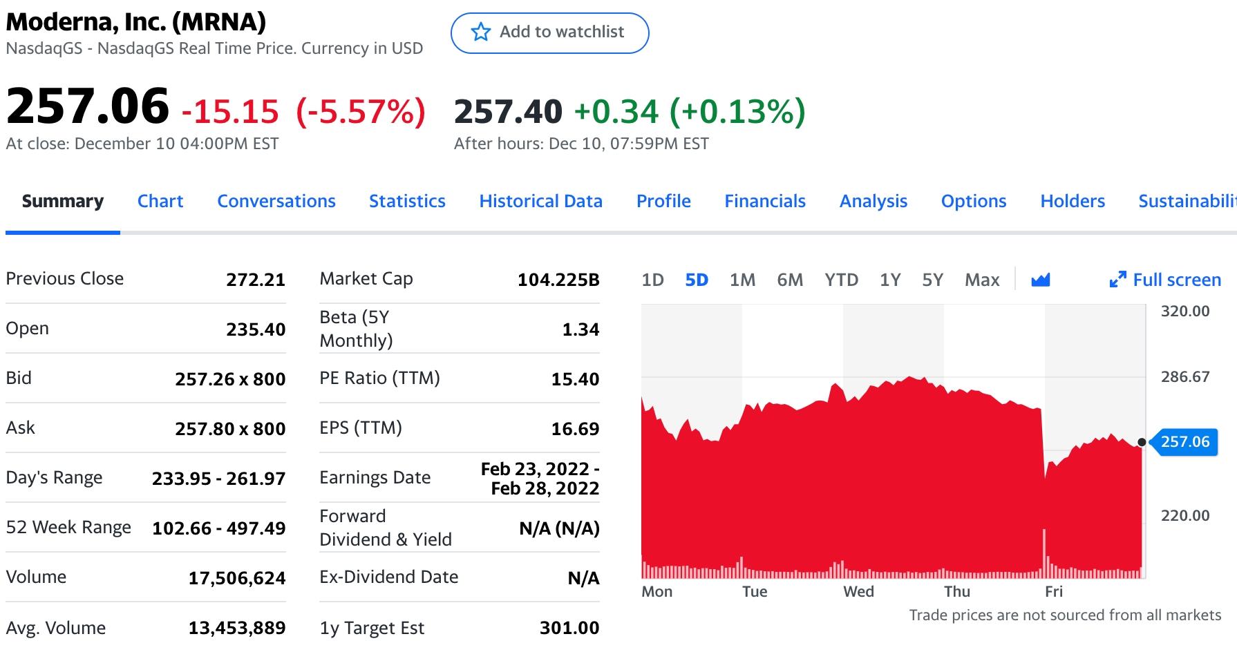 Once again, the legacy media have buried the lede while regurgitating Pharma press releases regarding the recent investor data disclosure from Moderna regarding the safety and efficacy of the Moderna quadrivalent (four-way) influenza vaccine candidate. Using a classic strategy to minimize impact of bad news, the damaging data were dumped on the last trading day of the week. Despite the transparent ploy, investors on the Street saw right through the subterfuge, and Moderna market capitalization took a 15 point hit (5.57%) by close of trading on Friday 10 December after a substantial selloff, while BioNTech (which uses the same UPenn “pseudouridine” patent of Kariko and Weissman together with very similar synthetic mRNA delivery compounds) took an even bigger “adjustment” of 26.53 points (9.33 %). I guess it is easier to fool legacy media “reporters” and US public health officials than it is to fool Wall Street Stock Analysts.