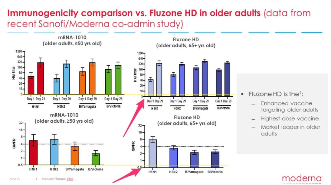 Note the subtle lower placement of the Fluzone data graphs, making the mRNA product appear more effective than it is relative to the licensed traditional Fluzone graphs. In a sharp-eyed tweet, @RobertLKruse gets the gold star for pointing out this trick in Moderna's slide comparing early efficacy data from its flu shot to a competitor. The y-axis being lower for Fluzone's shot is lower makes it look worse (and $MRNA's shot better) if glancing quickly and comparing the two graphs. For some reason, Moderna seems to have failed to perform statistical comparison of Fluzone versus Moderna flu jab data. Perhaps because they do not have enough capital to hire competent biostatisticians to run the numbers?