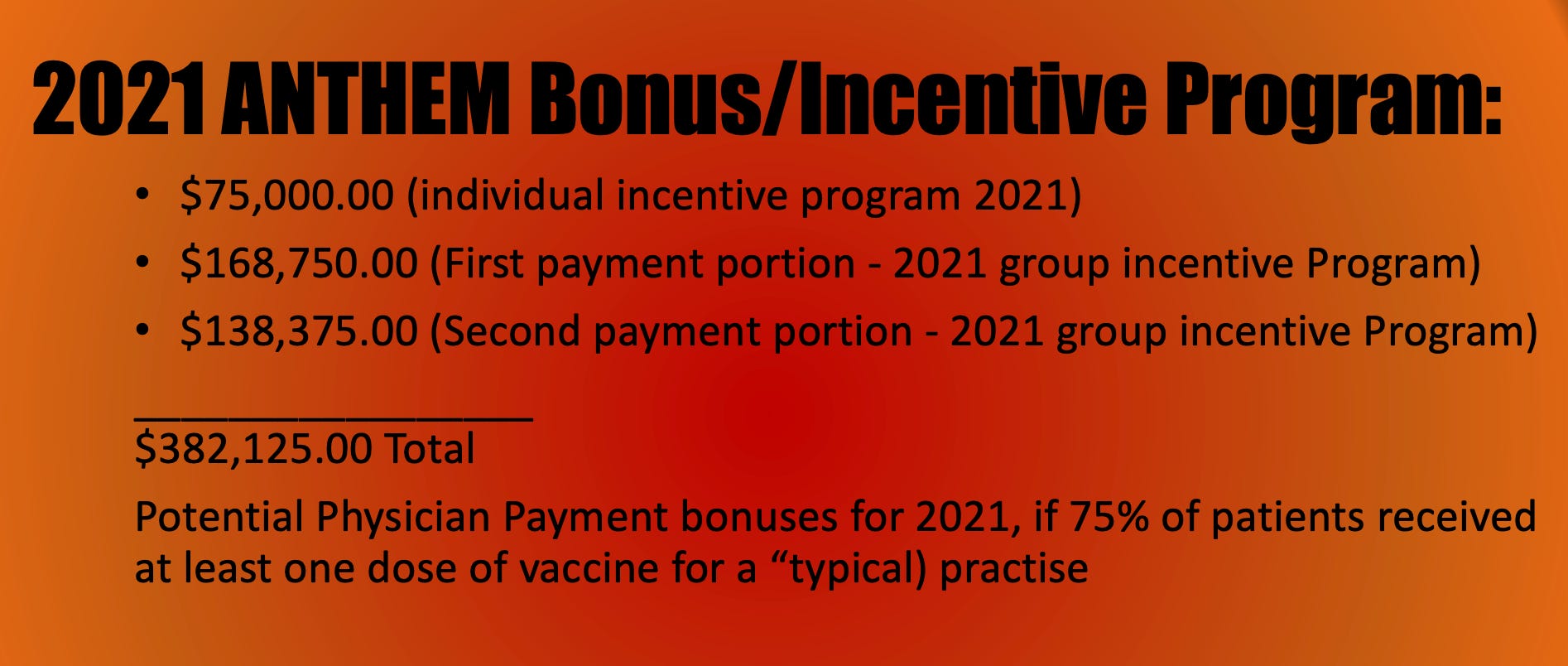 There were two main programs for “incentives” for this regulated biological product. The first was pretty straight-up; this many bucks extra per jabbed patient as an "incentive". The government paid insurance companies, who then would reimburse providers. The amount of money for this program is staggering, although the government has not made the individual distribution amounts of insurance companies, pharmacies, etc. public. Most likely, it will take a FOIA request to obtain specific information (if anyone has access to those documents, don’t hesitate to email info@rwmalonemd.org with copies or links!)