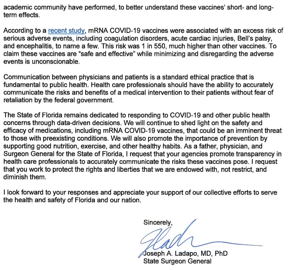 Florida Surgeon General Joseph Ladapo has now sent a letter to the Food and Drug Administration (FDA) citing that there is an 4,400% increase of reports of life-threatening conditions in Florida since the roll-out of the mRNA COVID-19 vaccine.