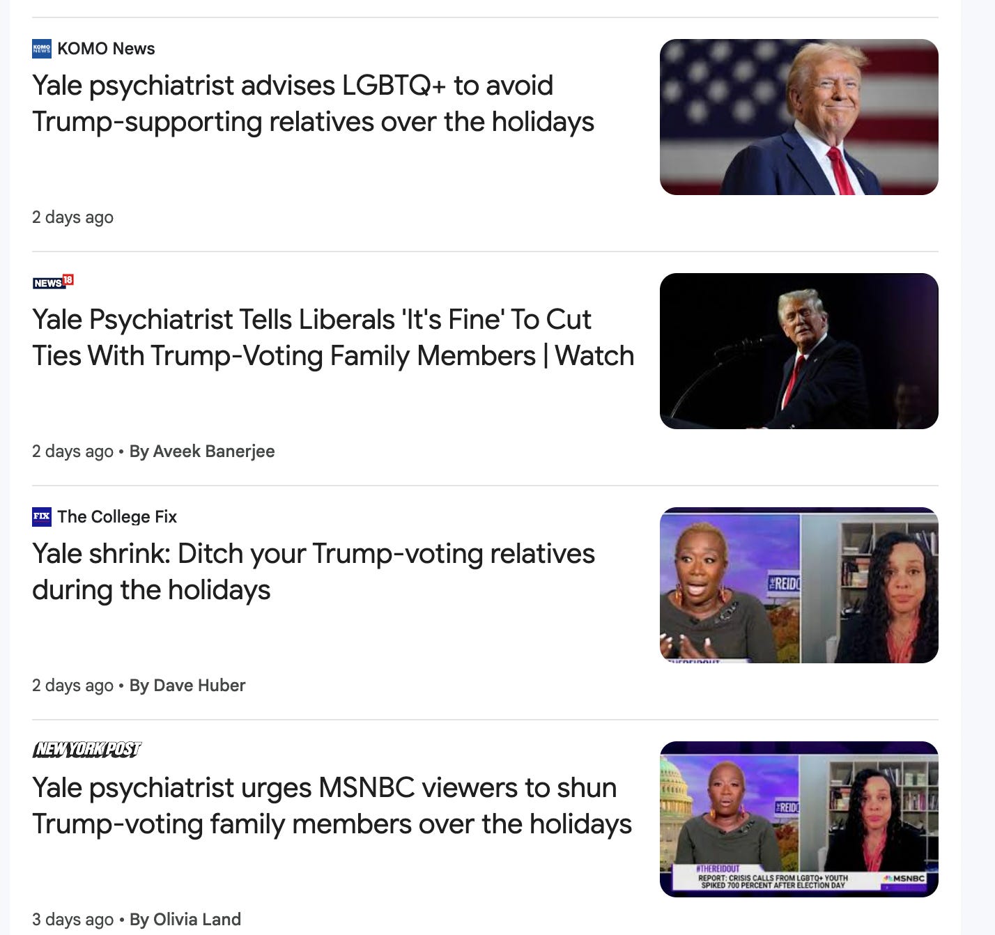 It appears that many psychiatrists and psychologists are advising their patients to boycott family members who voted for Trump because the emotional distress of meeting a Trump supporter is just too much for the progressives to handle at this point. And breaking bread with them? Out of the question!