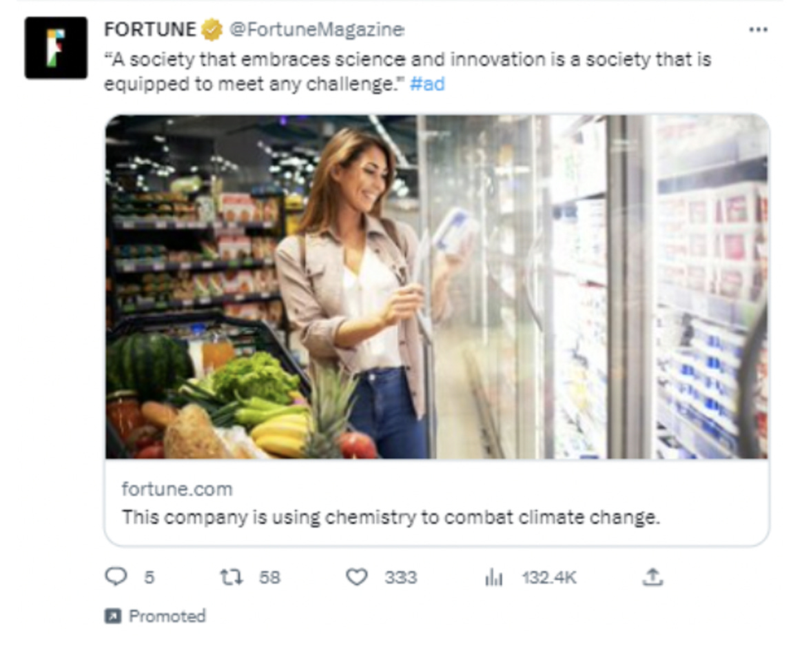 A Fortune magazine promoted article/advertisement for a company claiming to be working to combat “climate change”, advancing better living via chemistry.