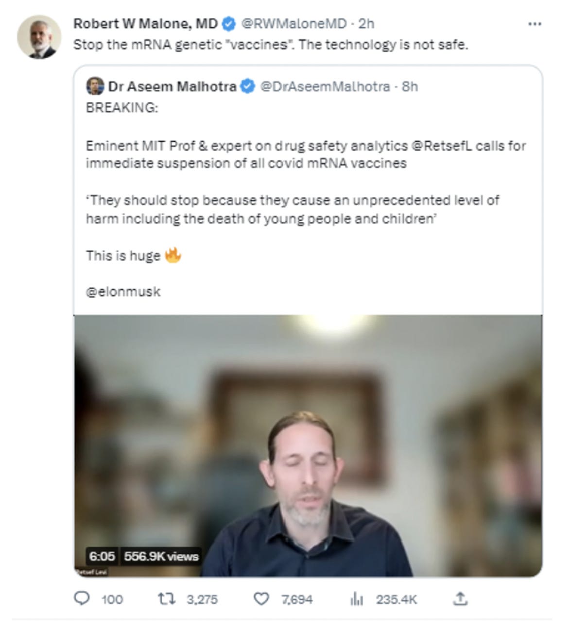 Note that this is a re-tweet of a post by the esteemed British cardiologist Dr. Aseem Malhotra, regarding a report from a MIT professor and expert on drug safety. The fact that these “vaccine” products which do not protect against infection, replication, or spread of the SARS-CoV-2 virus is now widely accepted, including in a recent publication by senior author Dr. Anthony Fauci. This not disinformation, this is fact. The mRNA “vaccines” are clearly associated with myocarditis, pericarditis, formation of unusual highly crosslinked fibrin clots, alterations in menstruation, and, according to a senior Pfizer executive, appear to be damaging the hypothalamic/pituitary/adrenal/gonadal axis. That is not safe, by anyone’s account.