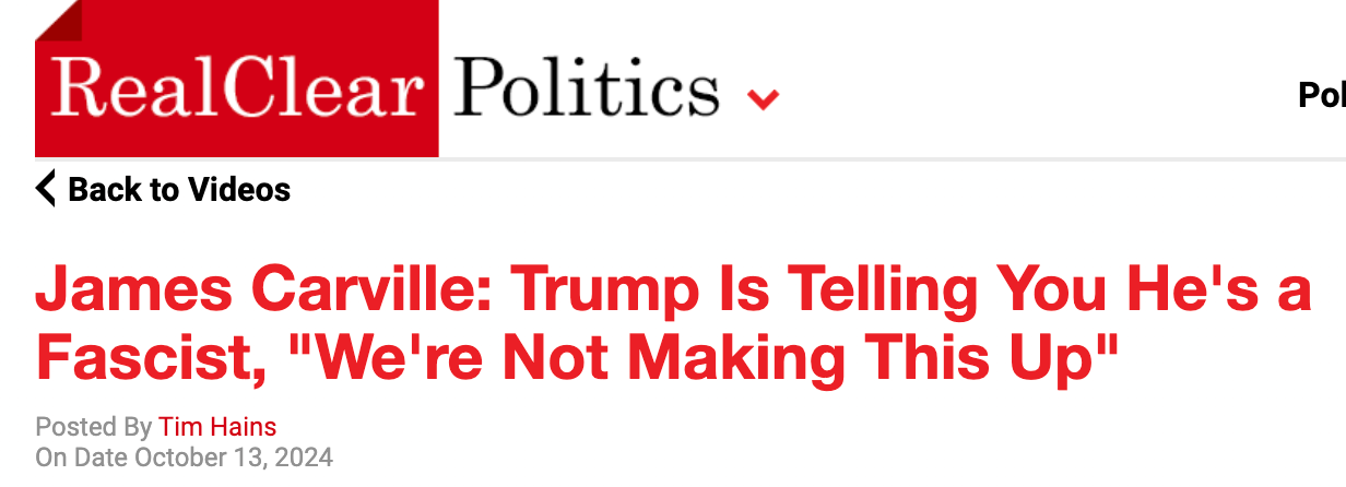 Real Clear politics ran with the story of an interview of James Carville, hauled back from the dregs of the Clinton Administration. Yep, they dragged him out of the closet yet again for the Harris race.
