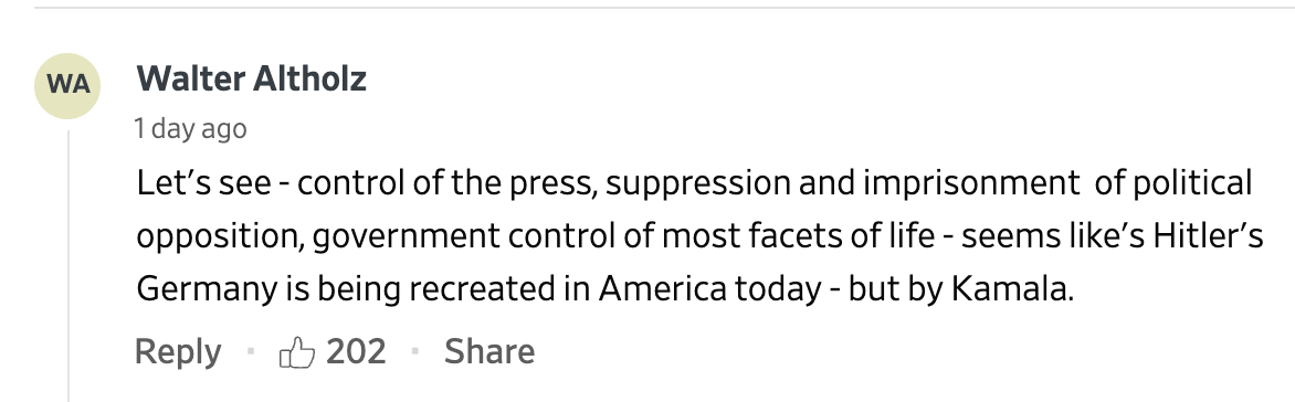No doubt both Senators despise the German mass murderer. But if Mr. Trump is so horrific, how can they have any kind of political association with him? Their ads cite issues on which they agree with Mr. Trump in an attempt to burnish their bipartisan image. But surely they don’t want to do anything to promote the election of a “semi-fascist” (President Biden’s description), or a “fascist” (Kamala Harris), or a wannabe Führer of an American Reich.