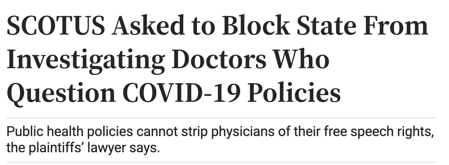 The Epoch Times lays it all out in the article: “SCOTUS Asked to Block State From Investigating Doctors Who Question COVID-19 Policies"