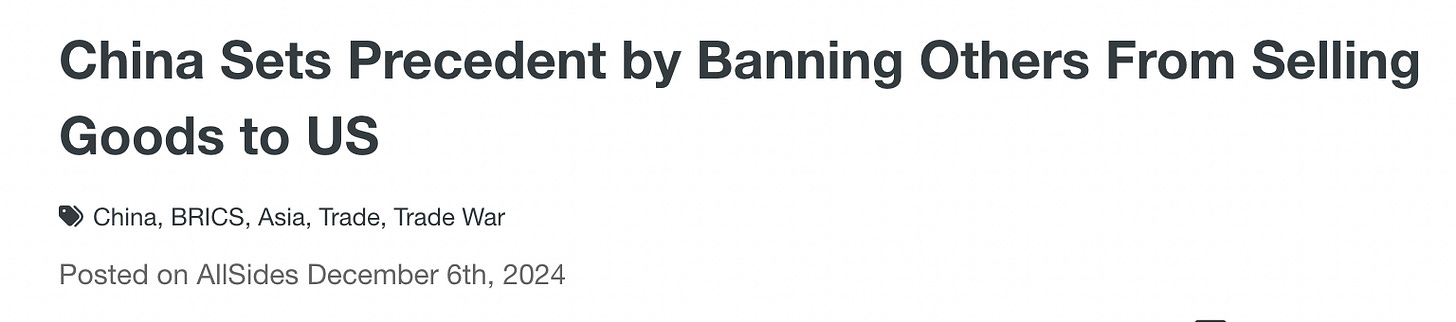 China is also banning companies outside of China, such as those Chinese companies operating in Africa and South America to stop selling to the United States. Of note - the United States, including the US military, is explicitly being targeted.
