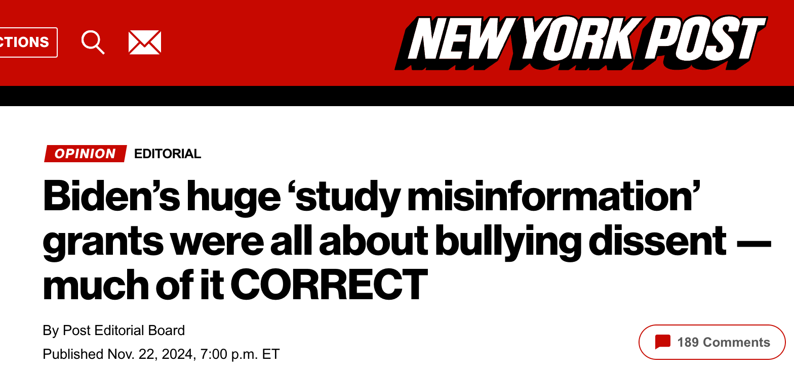 Wow: The Biden administration blew more than $127 million in 2021 alone on grants to “study” the spread of “misinformation” — much of which in fact was healthy skepticism of government-sponsored falsehoods.