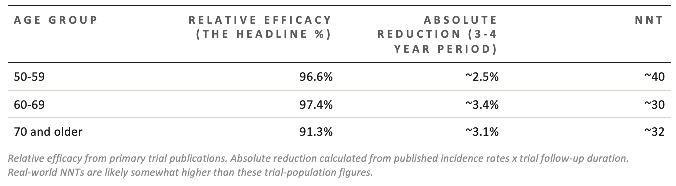 Notice: the relative efficacy is almost identical across all ages. But the absolute numbers diverge because the baseline disease rate varies. A 97% reduction in a low-risk group gives you less absolute benefit than a 91% reduction in a high-risk group.